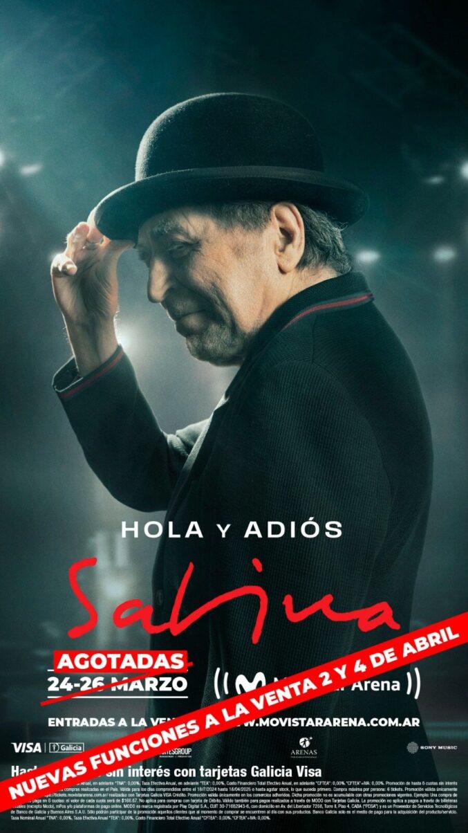 Tras agotar dos funciones en el Movistar Arena, el cantautor español Joaquín Sabina anunció este miércoles dos nuevas fechas en Argentina en el marco de su gira despedida, titulada «Hola y Adiós», para el miércoles 2 y viernes 4 de abril de 2025. Los precios de las entradas arrancan en los $65.000 más el costo del servicio y ya están a la venta en la web del estadio.