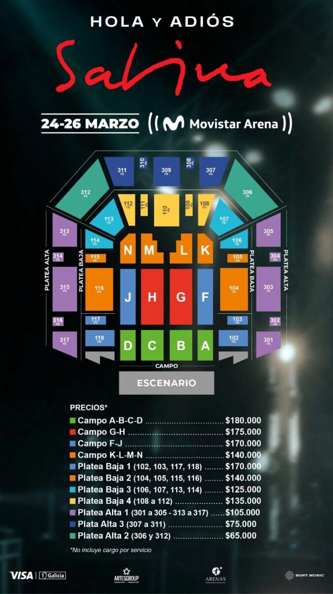 Las entradas para ver a Joaquín Sabina en el Movistar Arena ya están a la venta en la web oficial del estadio. Los precios de las entradas arrancan en los $65.000, más el costo del servicio. Los tickets se pueden pagar con tarjeta de crédito o débito Visa, Cabal o Mastercard. Los clientes del banco Galicia tienen el beneficio de hacer su compra en 6 cuotas sin interés. La lista completa con el precio de las entradas: