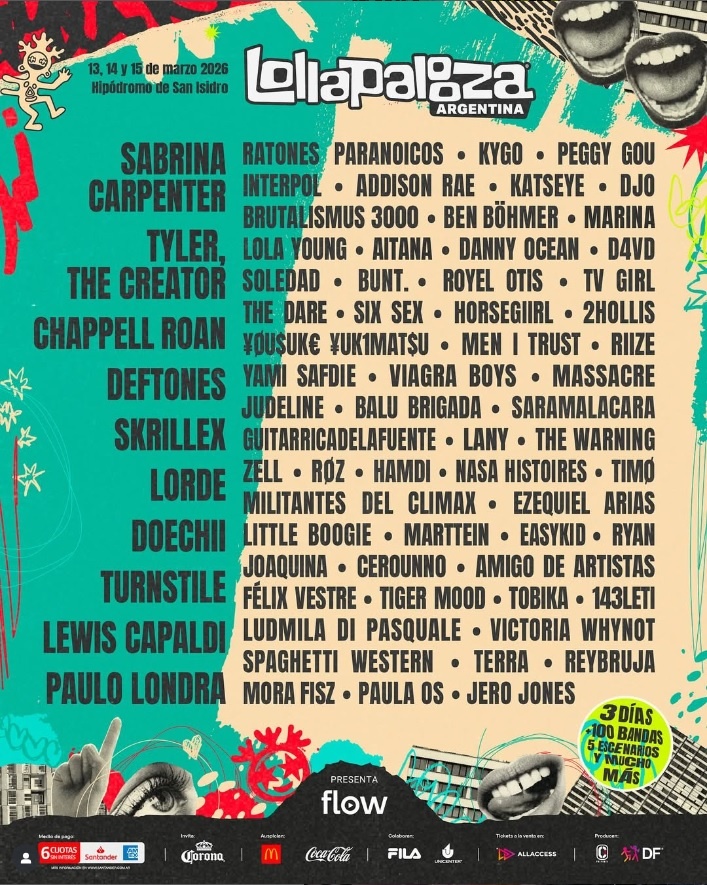 ras una larga espera, la producción del Lollapalooza Argentina 2026 reveló quiénes son los artistas que forman parte de la nueva edición del festival: Sabrina Carpenter, Tyler, The Creator, Chappell Roan, Deftones, Skrillex, Lorde, Doechii, Turnstile, Lewis Capaldi y Paulo Londra encabezan la grilla del festival porgamado para el 13, 14 y 15 de marzo en el Hipódromo de San Isidro.